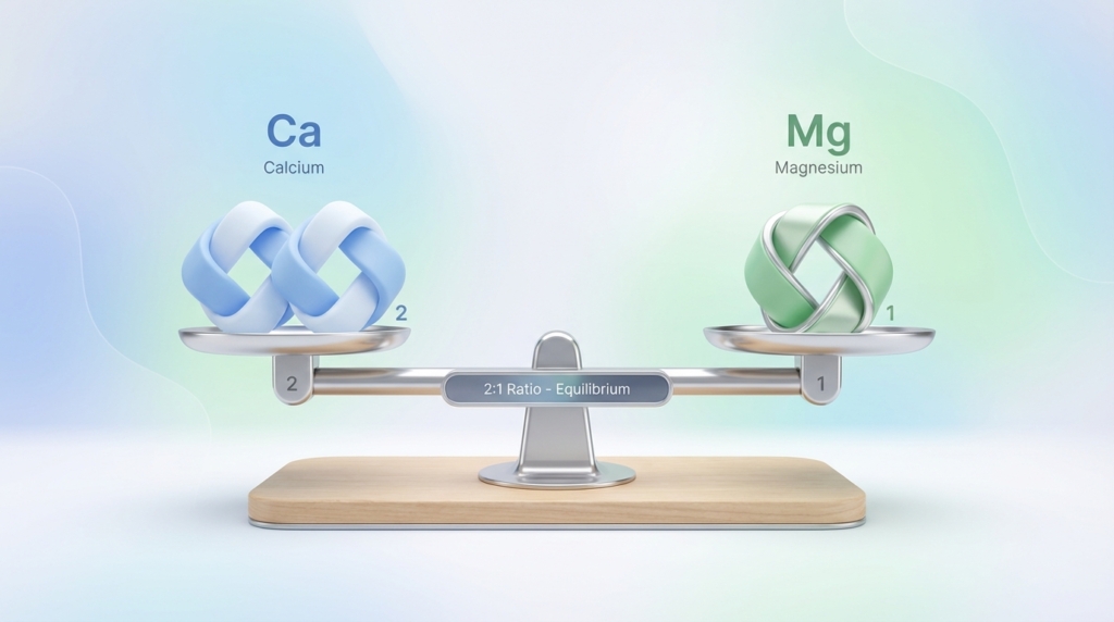 多くの栄養学者や研究者が推奨する理想的な比率は、カルシウム2に対してマグネシウム1です。この比率が崩れると、様々な問題が生じます。